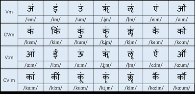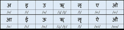 用来书写梵文的天城体文字共有47个文字符号,包括33个表示辅音的符号(表SAN-1)和14个表示元音的符号(表SAN-2)