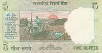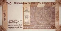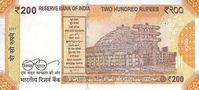 ⑦纸币背面左下角是“清洁印度运动(Swacch Bharat Mission)”的标志स्वच्छ भारत(/sʋət͡ʃt͡ʃʰ.bʱɑː.ɾət̪/)及口号एक कदम स्वच्छता की ओर (One Step towards cleanliness),“朝清洁迈出一步”。