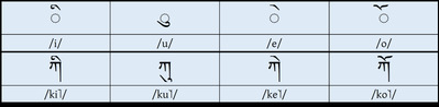 那什么元音附标文字呢?首先元音附标文字和拉丁字母、西里尔字母、阿拉伯字母一样,都是一种表音文字(Phonogram),不同的是,元音附标文字的一个字母,一般会附带一个元音。当与其他元音拼合时,元音以附标的形式写在辅音字母的上下前后的某一个或几个方位。上述六种文字的ka、ki、ku、ke、ko可以表记为: