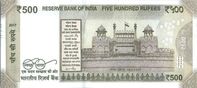 ⑥肖像的左边是“五百卢比”的天城体 ₹५००,对应背面最左边的पाँच सौ रुपये,其中पाँच(/pɑ̃ːt͡ʃ/)表示“五”,सौ (/sɔː/)表示“百”,रुपये (/ɾʊp.je/)是“卢比”रुपया的复数形式。