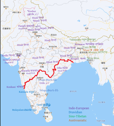 印度半岛语言复杂多样,古代便有佛教使用的巴利文、印度教使用的梵文以及各地方的地方通用语。现代印度境内使用的语言主要有印欧语系印度-伊朗语族印度-雅利安语支下的印地语和孟加拉语等,主要分布在印度北部和东部;达罗毗荼语系下的玛拉雅拉姆语、泰米尔语、泰卢固语等,主要分布在印度的南部。