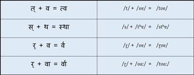 天城体还有辅音叠写的现象,即当两个或多个辅音连续出现时,会合写成一个连体符号。