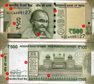 ①在纸币正面最上方的भारतीय रिज़र्व बैंक(Reserve Bank of India)和 पाँच सौ रुपये,意为“印度储备银行”和“五百卢比”。
