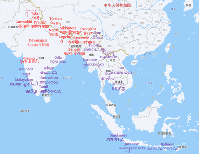 婆罗米系文字的分布:红色为北系,紫色为南系