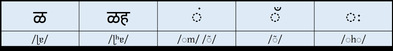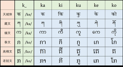 以使用这六种文字的印地语、藏语、缅语、泰语、柬埔寨语和老挝语为例,除藏语外,其余五种语言都有丰富的元音系统,印地语、泰语、柬埔寨语和老挝语的元音系统有长短音对立。此外,除柬埔寨语外,印地语使用重音,缅语有三个声调,藏语有四个声调,泰语有五个声调,老挝语有六个声调。